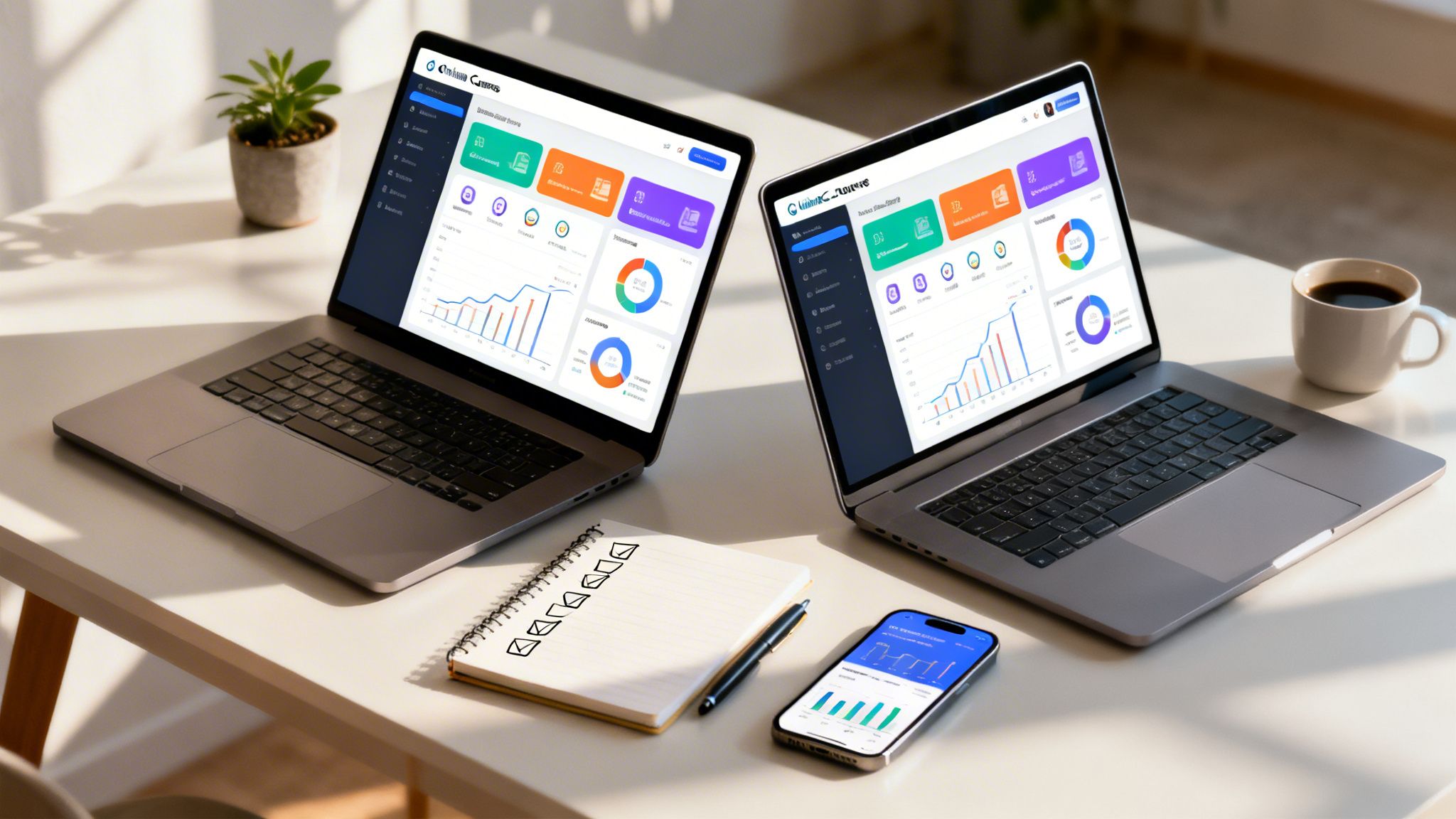 A white desk flat lay with a laptop, coffee, plant, and tablet showing a pre-launch checklist.