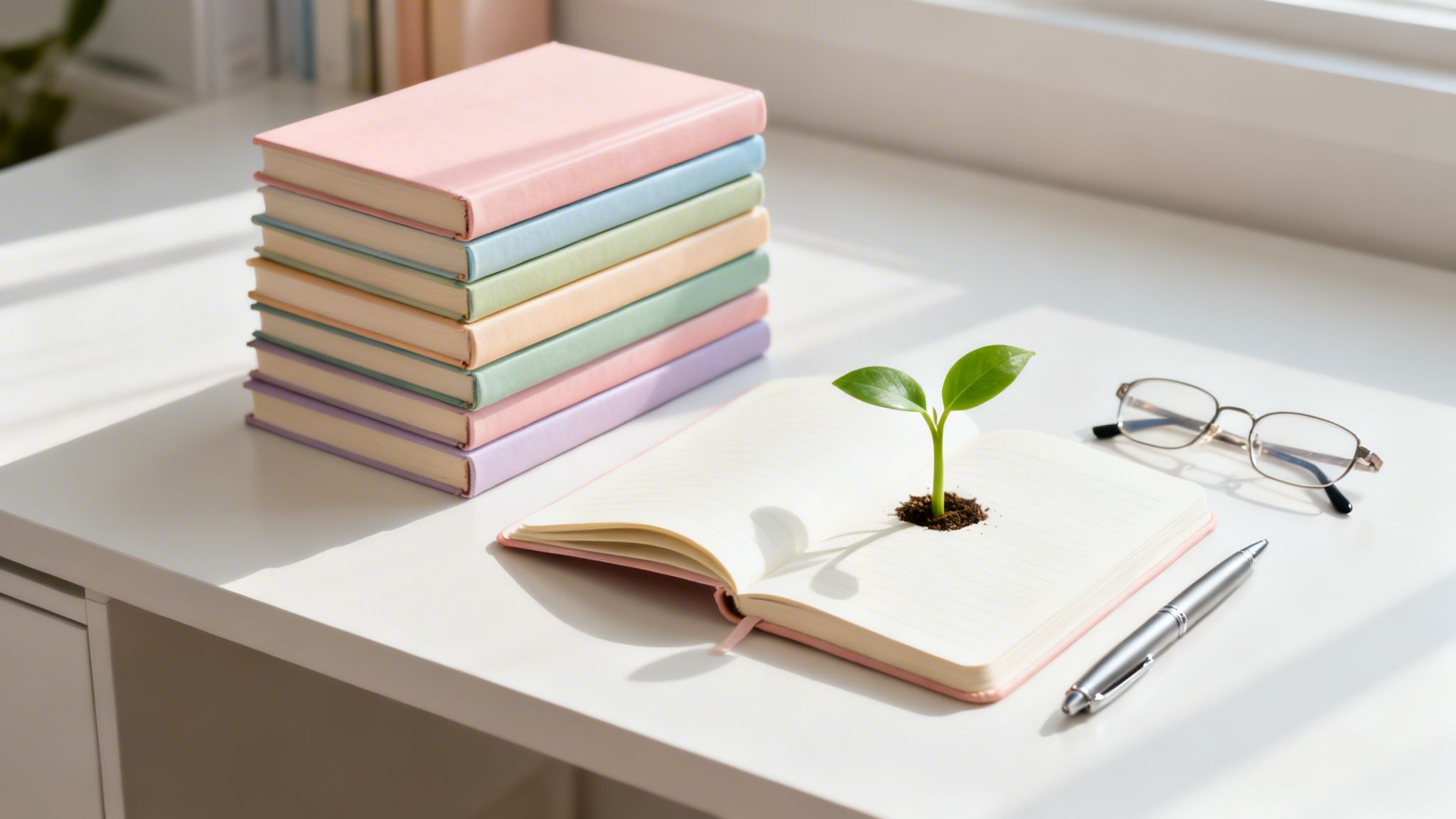 A personal growth book, an open journal with handwritten notes, a habit tracker, and a potted plant on a desk.